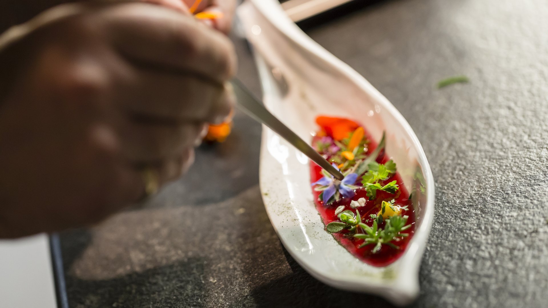 Herve BUSSET « Sauvage par Nature » Chef autodidacte, formé par l’ethnobotaniste François Couplan, ramasse chaque matin herbes et plantes sauvages pour concocter une cuisine nature. Sureau, plantain, lierre terrestre, fenouil sauvage, bergamote, pimprenelle et fleur de bourrache escortent de beaux produits locaux.Menu Reflet en 6 services
